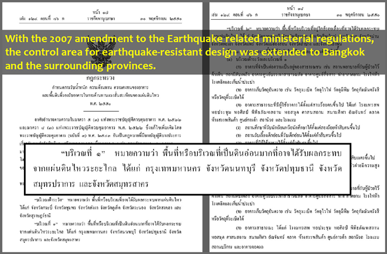 タイでは耐震対策として、2007年の省令改正において、バンコクを含む5県が、地盤の軟弱性と遠方地震の影響を考慮した「区域1」に指定されたことに伴い、「耐震設計義務化」が課されました。さらに2019年には、新しい地盤特性に基づく設計スペクトルを盛り込んだ国家標準DPT1301/1302-61が発効し、さらに規制が強化されています。
