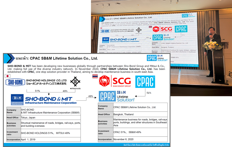CPAC SB&M Lifetime Solutionは、タイのCPACと日本のショーボンド/三井物産の合弁企業で、東南アジアのインフラ維持管理を担います。提供サービスは、構造診断、補修、補強、構造保護です。具体的には、エポキシ樹脂等を用いたひび割れ補修、剥離や腐食部分の断面補修(パッチング/ グラウト工法)、HBシートや特殊コーティングによるコンクリート構造物の保護を行います。また、地震や風による揺れを吸収する粘性ダンパーなどの制振システムも提供し、構造物の長寿命化に貢献します。