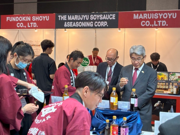お酢の横井醸造は、ハラル認証を取得した製品も展示していたこともあり、高い注目が集まりました。視察に訪れた星日本大使やシンガポール・ハラル・料理連盟(SHCF)の会長に対し、担当者が製品の説明を行う場面も見られました。
