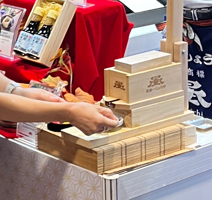 昨年に引き続き出展した醤油の岡直三郎商店。今回はこだわりの生醤油も出展。製造過程の一つである「もろみ絞り」を体験できる器具を持ち込み、搾りたての生醤油をその場で味わっていただく試みは、多くの来場者を驚かせました。この体験は「醤油はどのように作られるか」という理解を深める貴重な機会となりました。