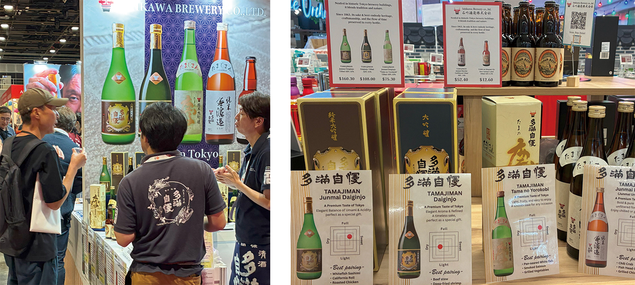 入ってまず目に留まるのが石川酒造。日本酒は昨年と同様に数多くのブースで展示されており、試飲に訪れた来場者の賑わいからも、現地での人気ぶりがうかがえます。