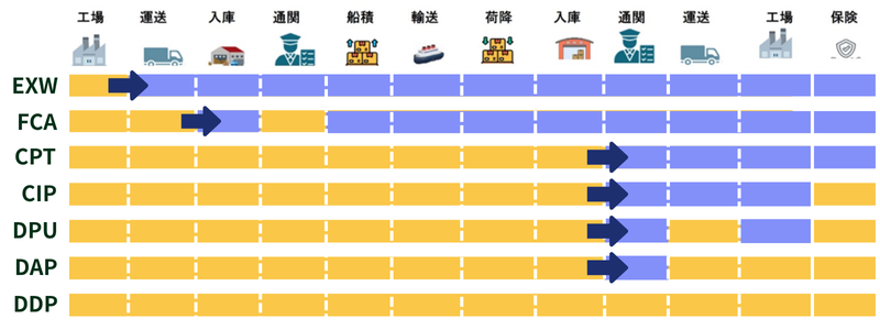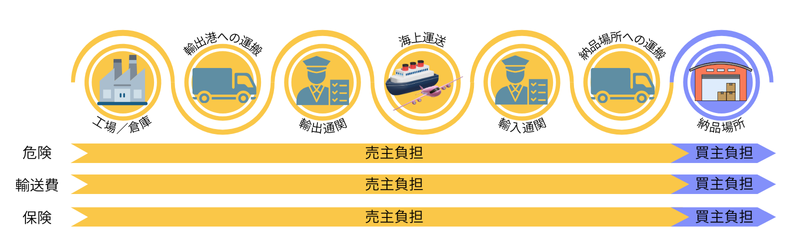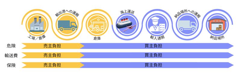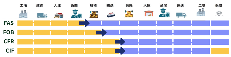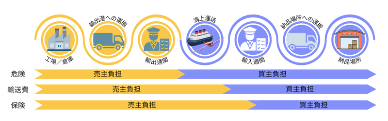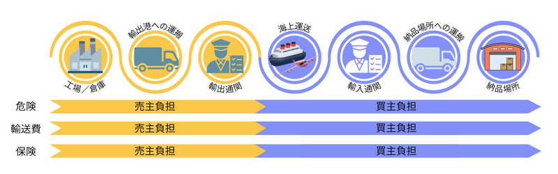 | 売主の責任 | ~引渡、輸出通関 | ~輸出通関・積込 | ~輸出通関・積込・海上運賃・最低限の保険 | 全行程(輸出・運送・保険・輸入) |