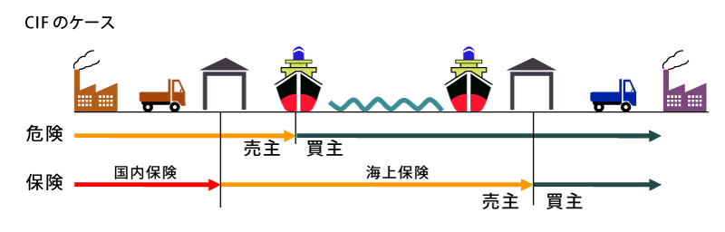 「CIF」「CIP」条件の場合は、保険の手配は「売主」がしますが、海上でのリスクに対する責任は「買主」に移っています。 つまり、事故が起きた際に保険会社と交渉し、共同海損の手続きを進めるのは「買主」なのです。買主側は、売主がどんな条件の保険(ICC(C)などの最低限の条件ではないか等)を掛けているか確認しておく必要があります。