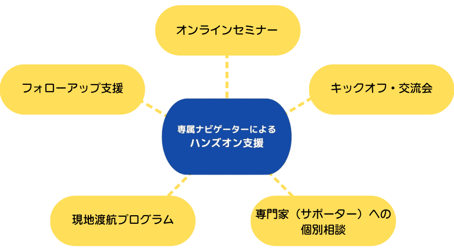 貴社の海外市場への挑戦を成功に導くため、専属のグローバルナビゲータが2年間ハンズオン支援で伴走し、海外の販路開拓を支援します。