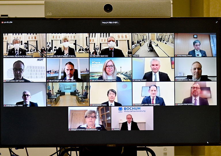 署名式は、新型コロナウイルス感染症の影響を受け、オンラインで行われました。立会人としてイナ・レーペル駐日ドイツ連邦共和国大使及び岩間公典在デュッセルドルフ日本国総領事が出席し、両者が見守る中、村松明典東京都産業労働局長、アンドレアス・ピンクヴァルトNRW州経済・イノベーション・デジタル化・エネルギー大臣が覚書に署名しました。