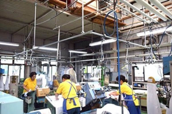 クールミストLineを設置したクリーニング工場の様子。以前は夏場以外でも40℃以上を記録していたが、導入によって27℃程度まで下げることができ、作業員からは好評を博している