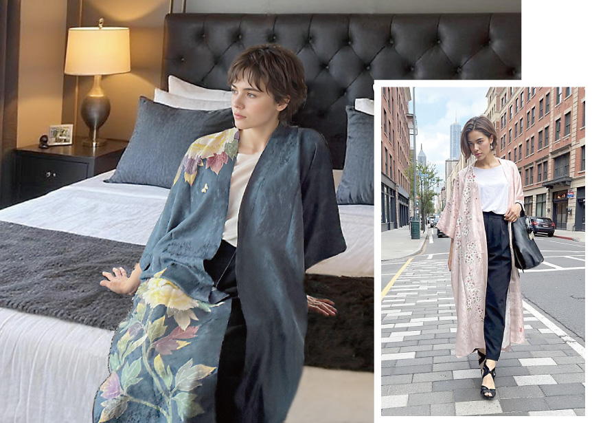 ①着物職人によるデザイン:着物を彩る芸術を現代のデイリーウェアに昇華させた纏う芸術 ②100%シルク:肌と同じタンパク質でできたシルクで、一度着たらやめられない気持ちよさ。全商品洗えるシルクのためお手入れも簡単。シルクの高級感がフォーマルにも使える1着として大活躍。 ③100%Made in Japan:全工程国内生産の、日本品質。日本の職人が世界で輝くための舞台としてのブランド