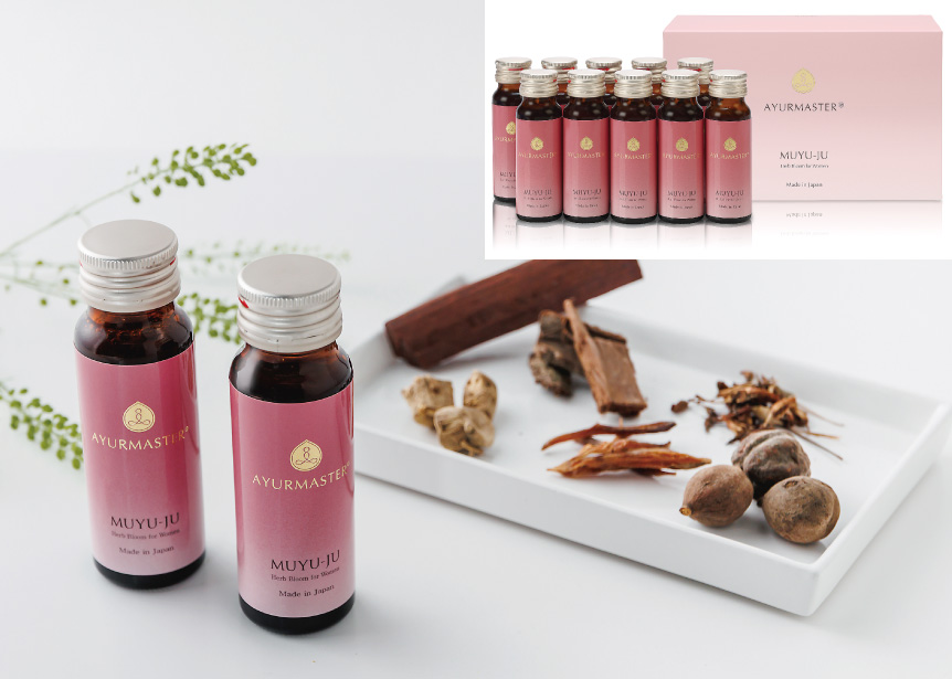アーユルマスターは、アーユルヴェーダと現代科学を融合した横浜市立大学発のリバースエイジングブランドです。MUYU-JUは女性向けAyucelra-Fem(15種ハーブ)配合ハーバルドリンクで、年齢に伴う心身の悩みや妊活をサポート。