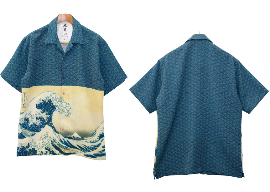葛飾北斎『神奈川沖浪裏』を北斎ブルーの青海波と組合せた丹後ちりめん製アロハ。ポリエステル素材で速乾・耐久性に優れ、夏も快適。すみだ北斎美術館所蔵原画を使用し墨田区工場で生産。ふるさと納税返礼品・すみだモダン認証品として高評価を得ています。