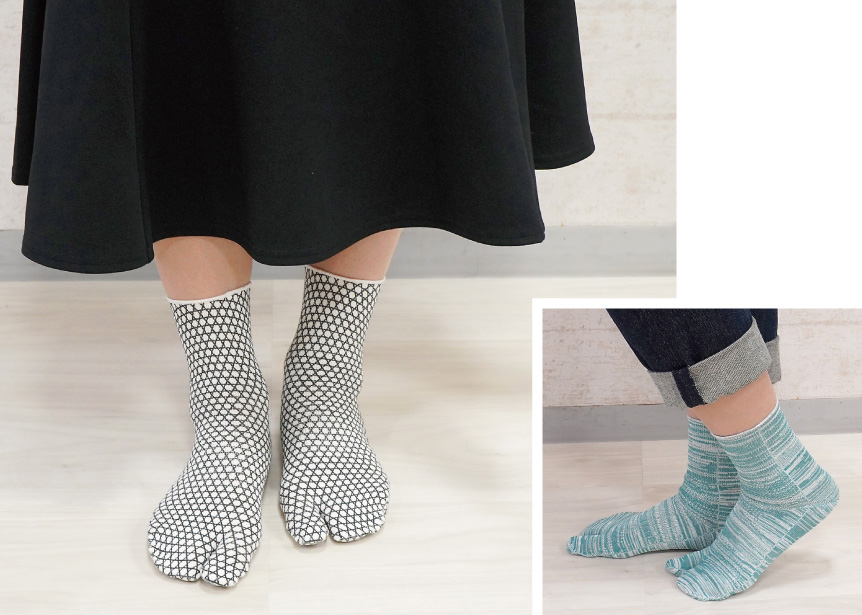 和紙78%の混用率の靴下は、和紙天然由来の抗菌・防臭・調湿効果に優れている。また編み方も3D編みで、足型に合うように制作しているので、フィット感抜群で、リピーターの方が多いのが特徴です。