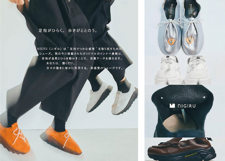 ”足指でつかむ”感覚を取り戻すためのシューズブランド。靴の中に搭載されたオリジナルのインナー鼻緒は、足指がひらき自然と動かすことで、足裏アーチを鍛えます。日々の動きに密かに作用する、新感覚のシューズです。オリジナルインナー鼻緒(国内特許取得)足の専門医下北沢病院による検証と見解をもとに開発、国内一貫生産