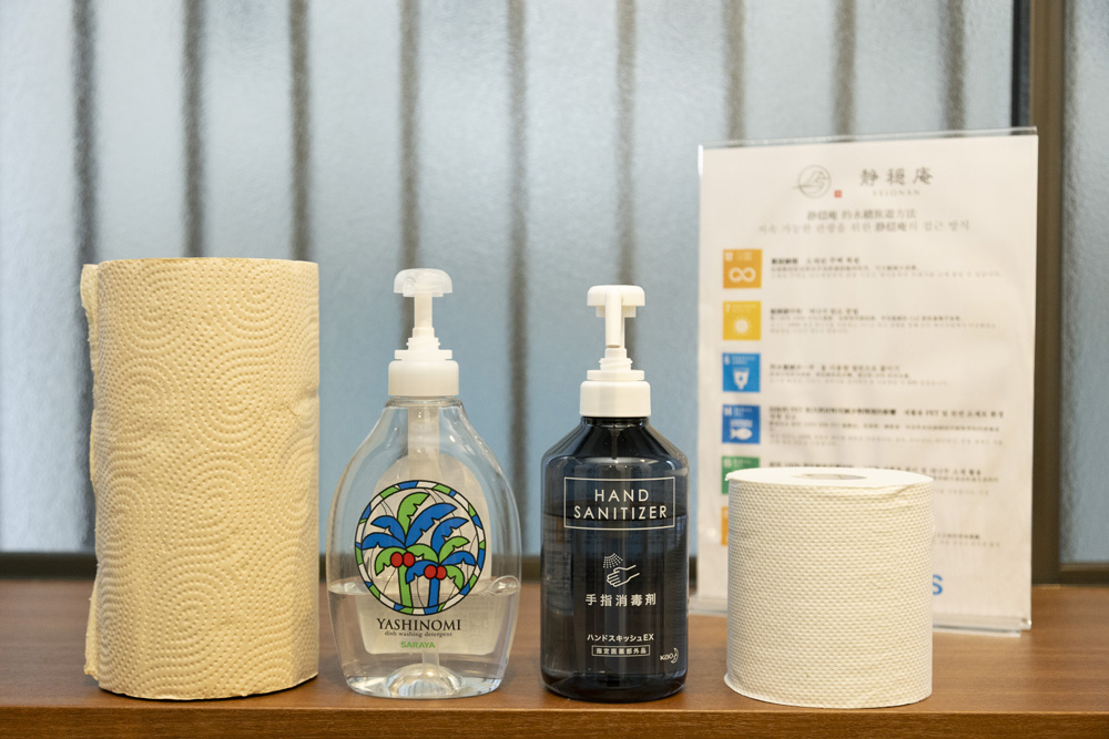 旅行をすると、飛行機での移動などによってどうしても環境に負荷がかかります。せめて宿に滞在している間だけは環境に負荷をかけなくても済むように、使用するエネルギーはカーボンニュートラルを100%達成したものにしています。CO2フリー電力を導入し、ガスについては使用量からCO2排出量を計算して、その分を吸収できる植林活動へ寄付を行っています。アメニティにも配慮し、シャンプー類や洗剤は環境負荷の少ない製品を使用、飲料水は100%サステナブル素材のボトルを採用し、紙製品は再生紙や竹素材のものを選んでいます。
