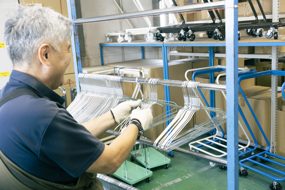クリーニング屋さんで使用する、衣類を入れる大きなワゴンやハンガーを大量に掛けられる丈夫なラックなどの什器、及び、ハンガーの製造を行っています。多くは販売代理店に卸して流通していますが、時代の流れを受けてインターネット販売にも力を入れているところです。インターネットの直販では、主にホテルや病院などのお客様に向けて販売を行っています。病院や介護施設では洗濯物の臭いが気になるという声があり、ペダルで開閉する蓋つきのワゴンも開発して販売しています。こうした商品開発も自社で行い、製造も自社工場で行うことで高品質で機能的な製品をお届けできることが当社の強みです。既製品だけでなく、寸法を変えるなどの特注品も承っています。