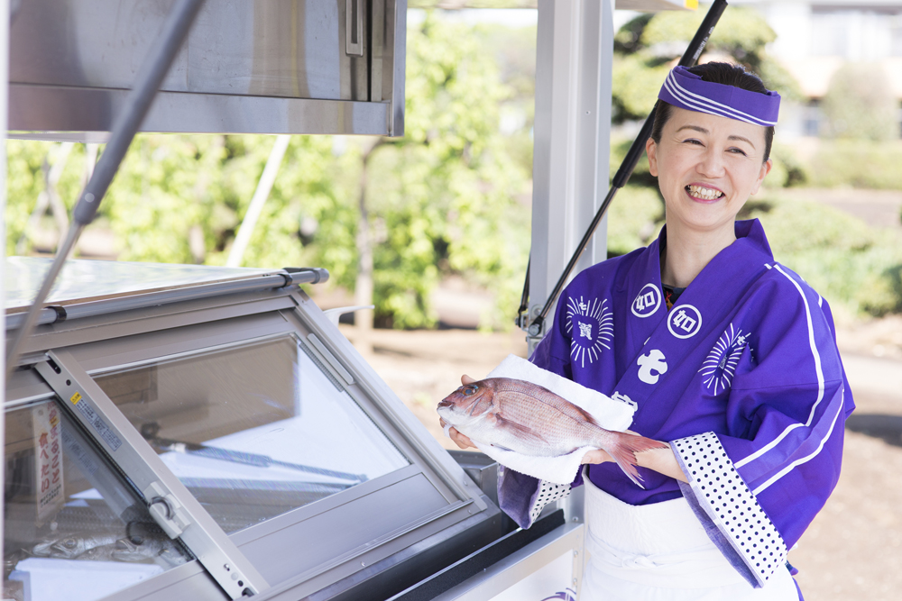 ショーケースが付いた小型トラックでお客様のお宅を一軒一軒回り魚の販売をしている、いわば移動鮮魚店です。昭和53年に先代が創業し、50年近く同じやり方で商売を続けています。当時は、お客様を待つよりもこちらから積極的にお伺いしようという思いからこのような販売スタイルになったのだと思いますが、今では、買い物に行きづらいご高齢の方や、下ごしらえに手間をかけずに魚を楽しみたいという方々を中心にご利用いただいています。